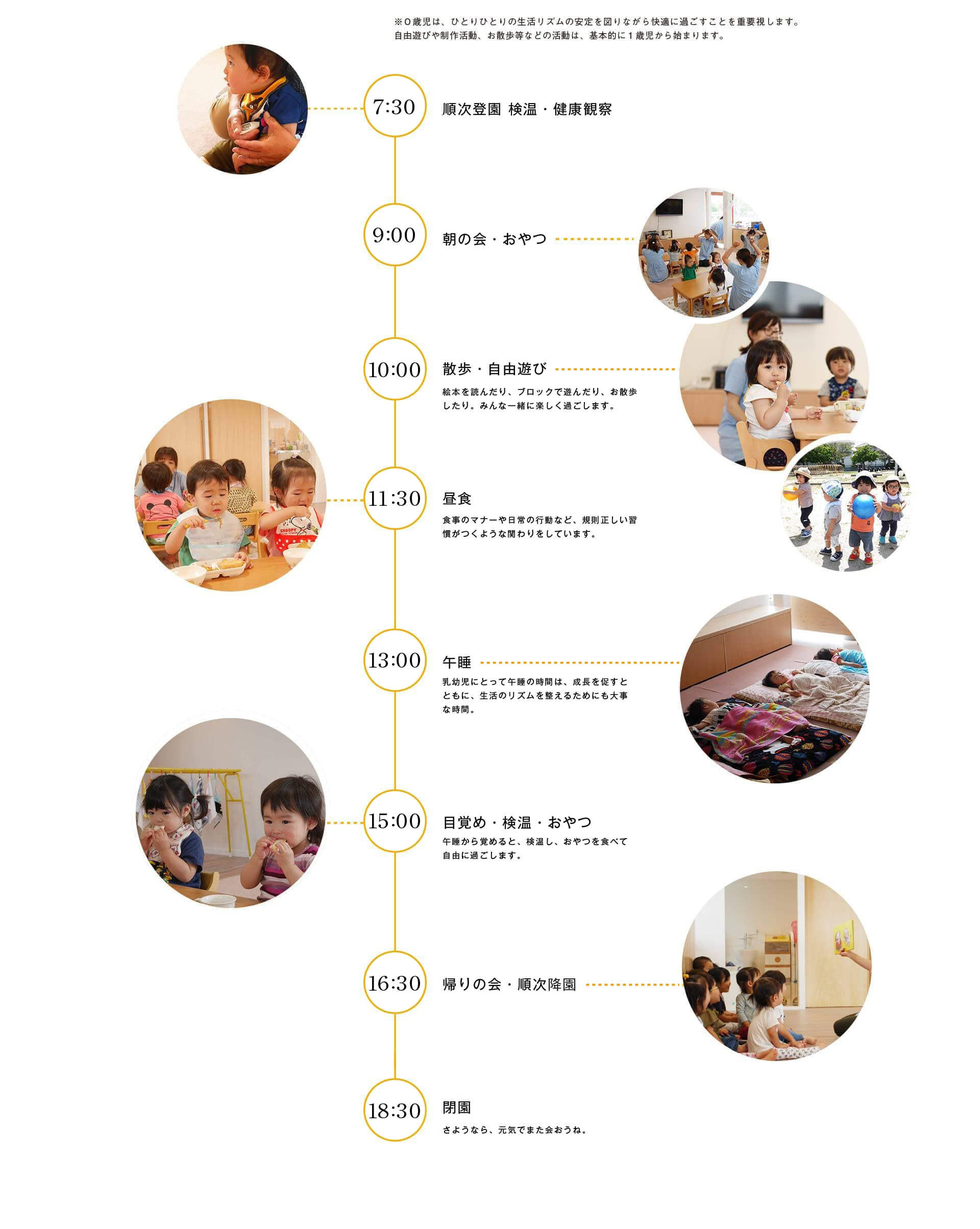 ※0歳児は、ひとりひとりの生活リズムの安定を図りながら快適に過ごすことを重要視します。自由遊びや制作活動、お散歩等などの活動は、基本的に1歳児から始まります。