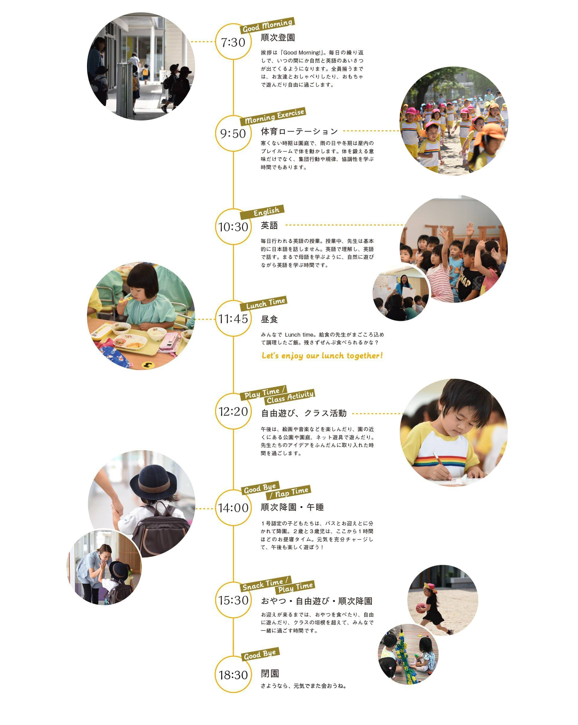 Morning!」。毎日の繰り返しで、いつの間にか自然と英語のあいさつが出てくるようになります。